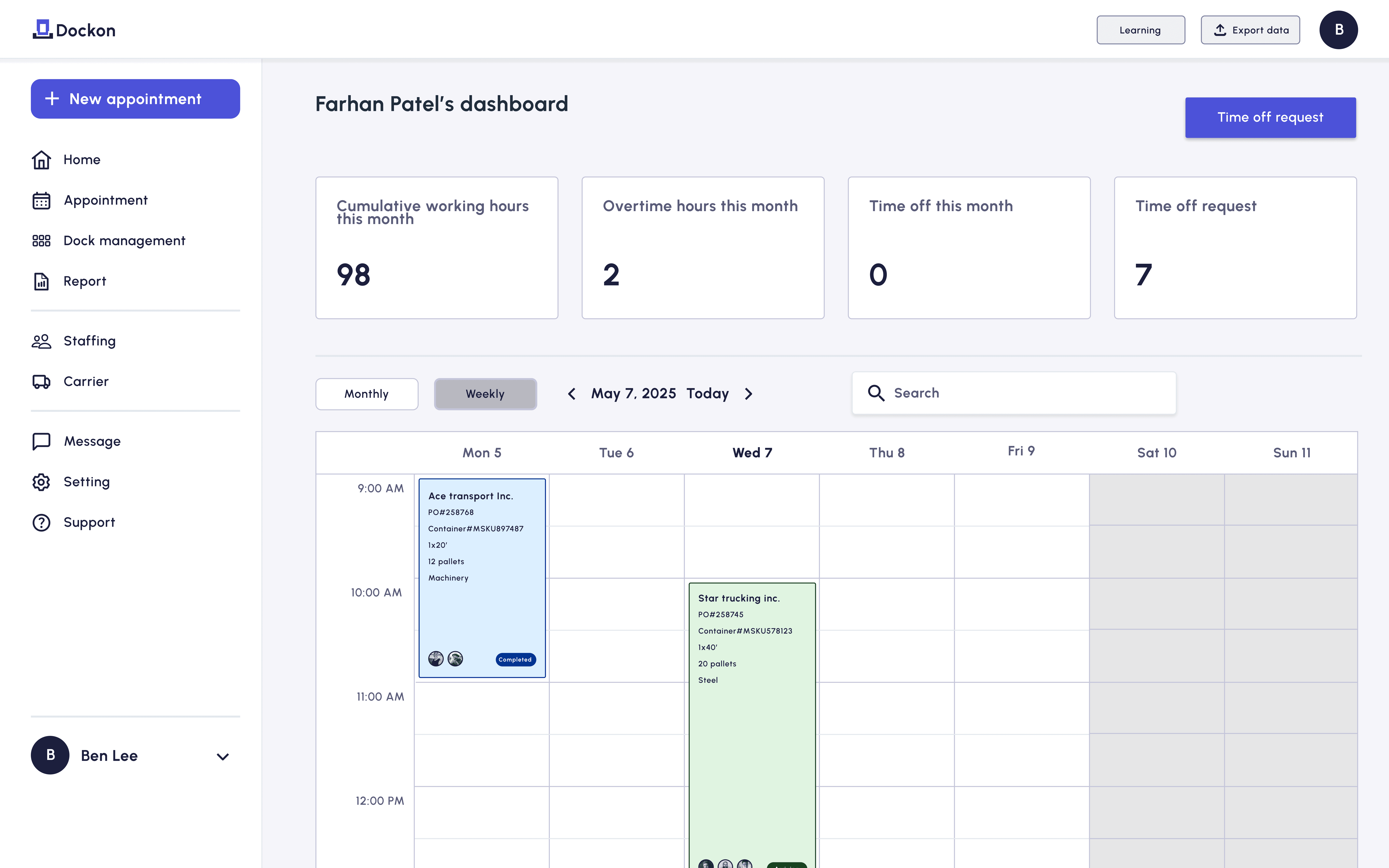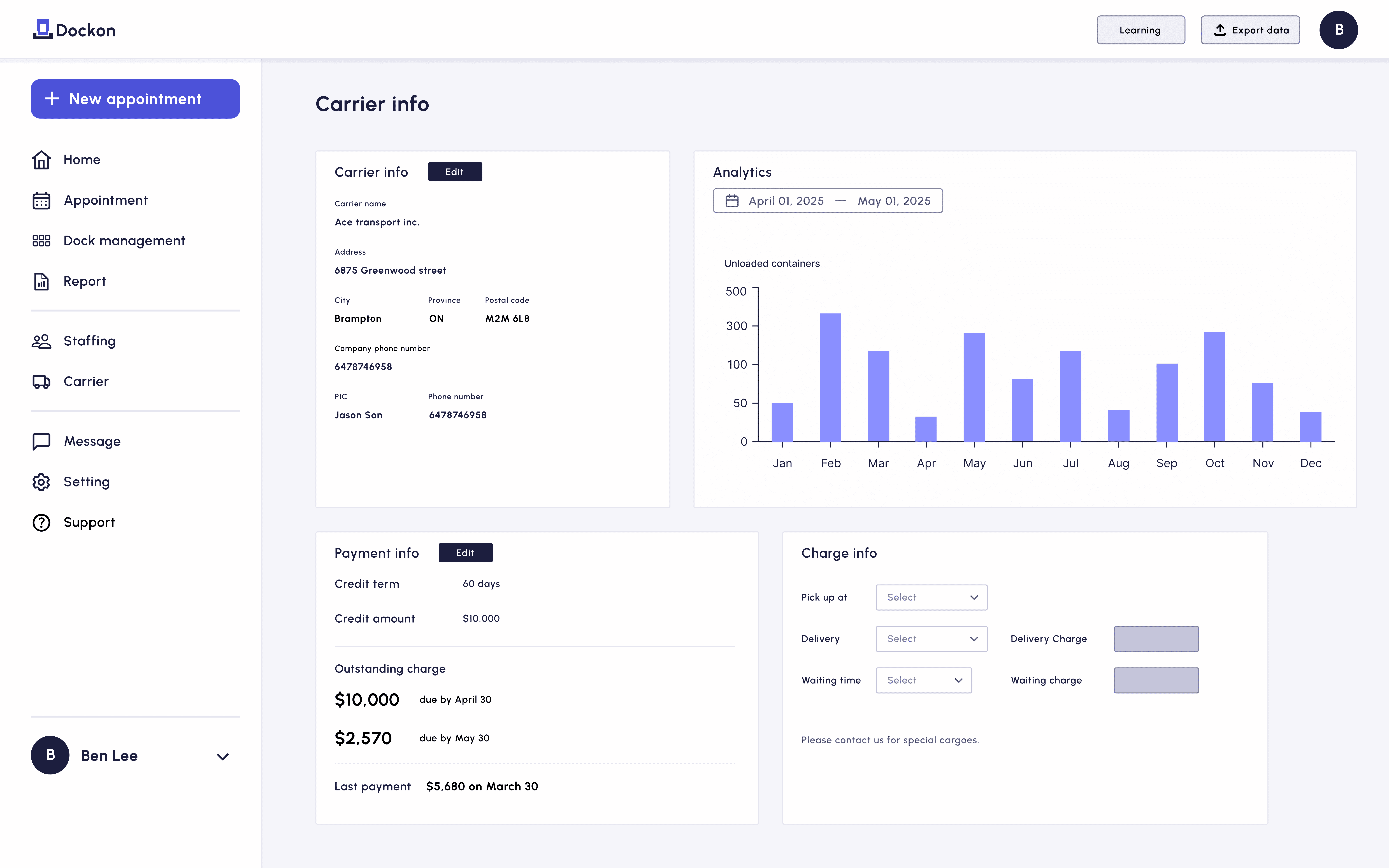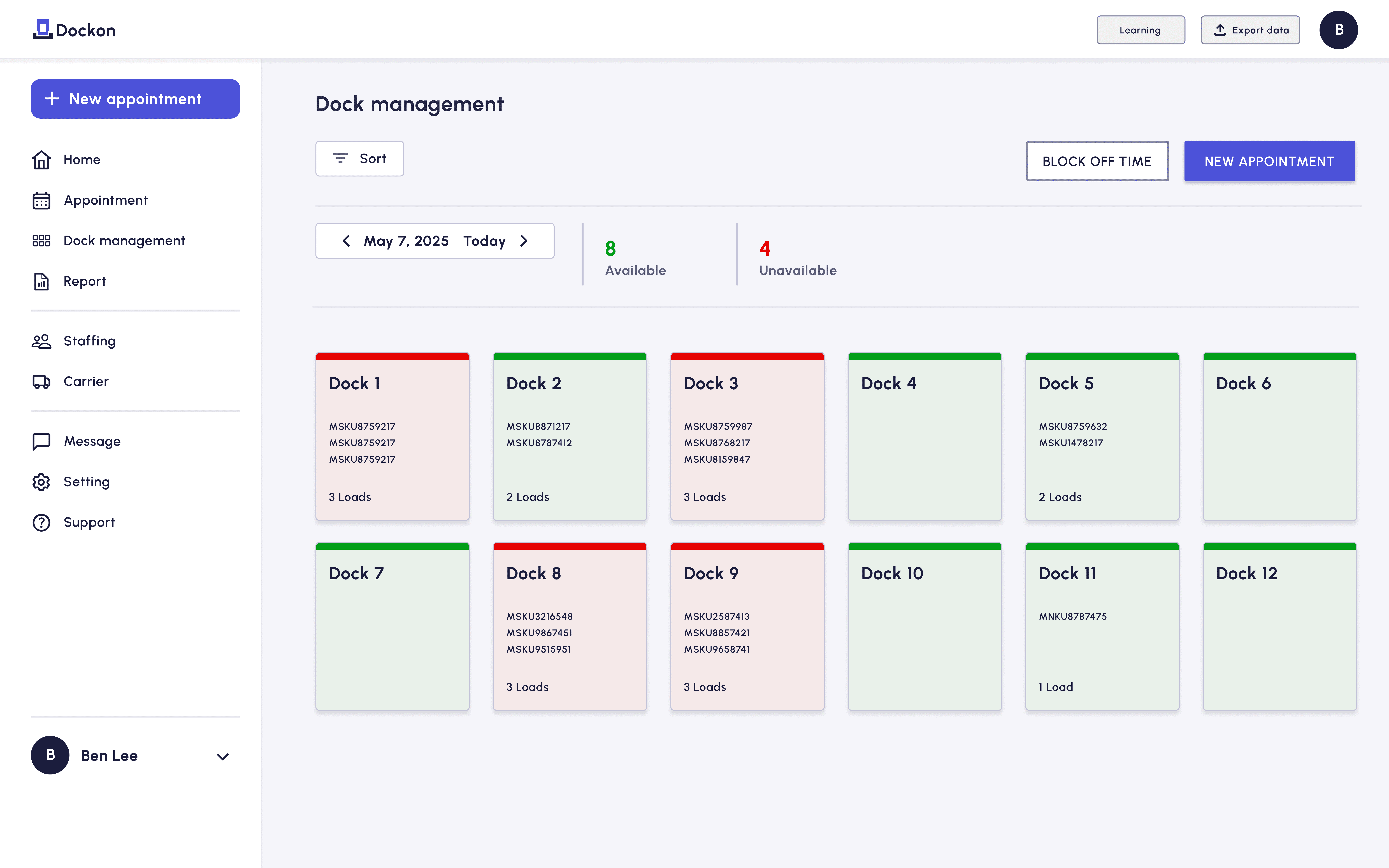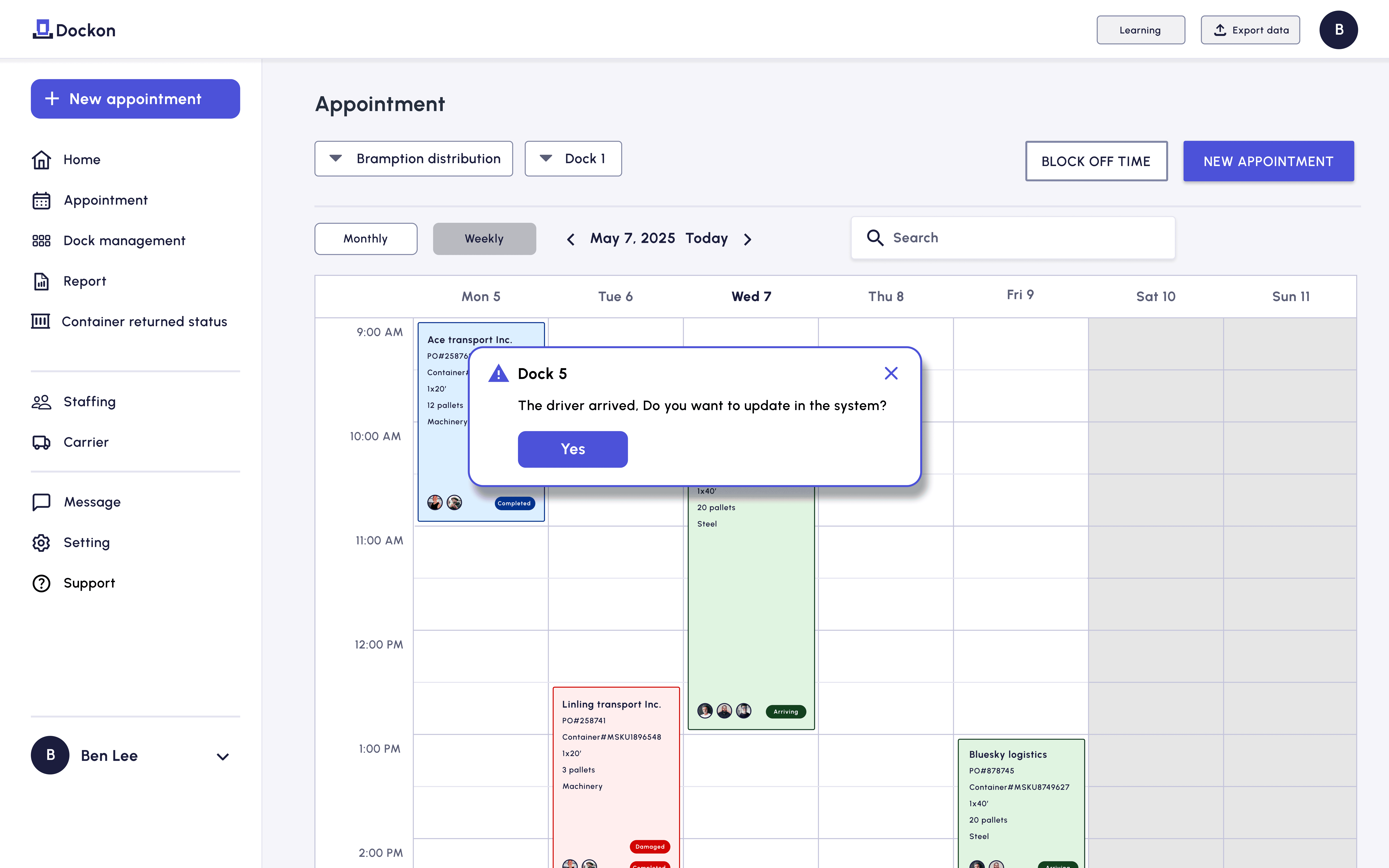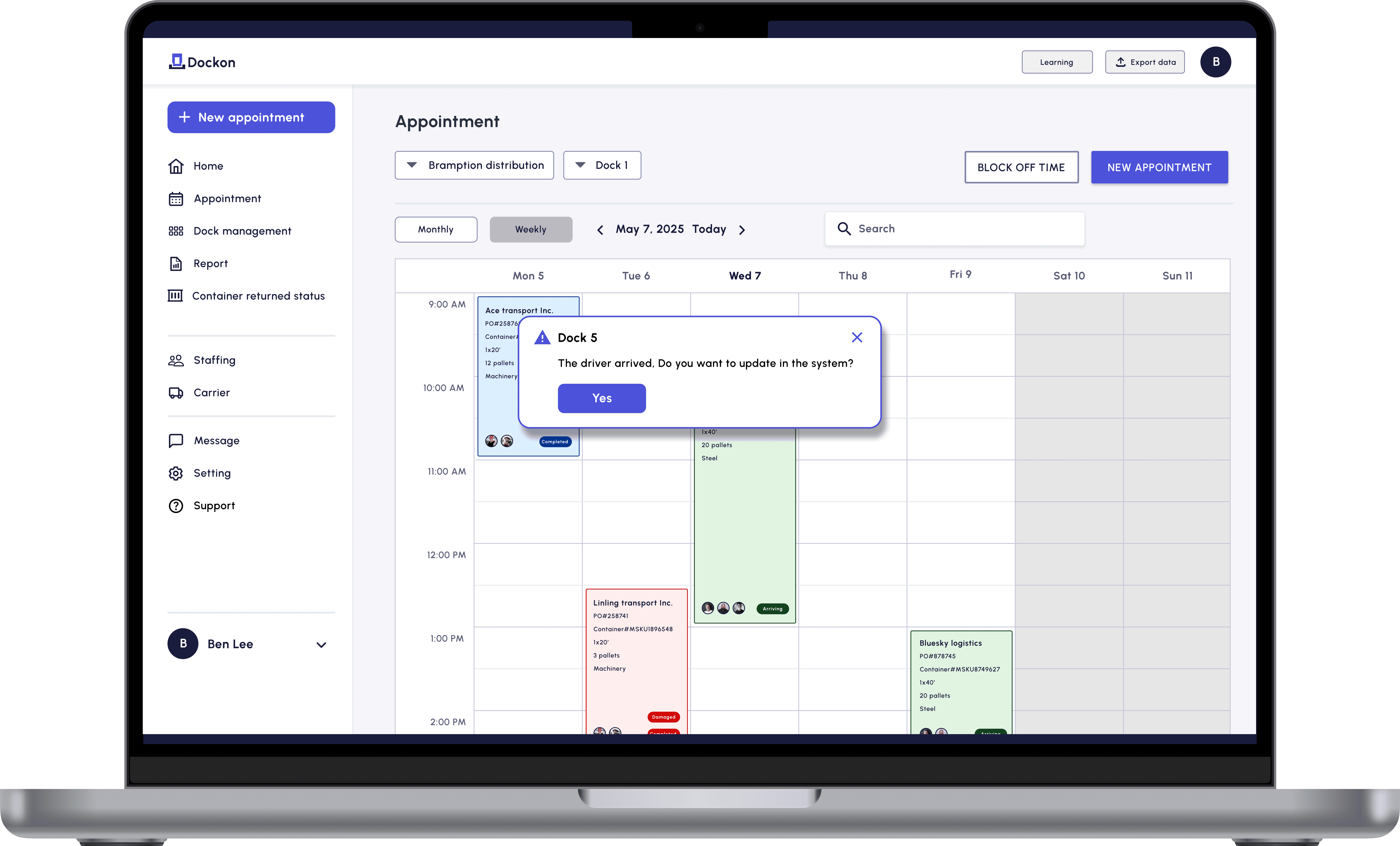 Dockon is a SaaS platform that allows users to efficiently schedule docks to prevent additional charges.