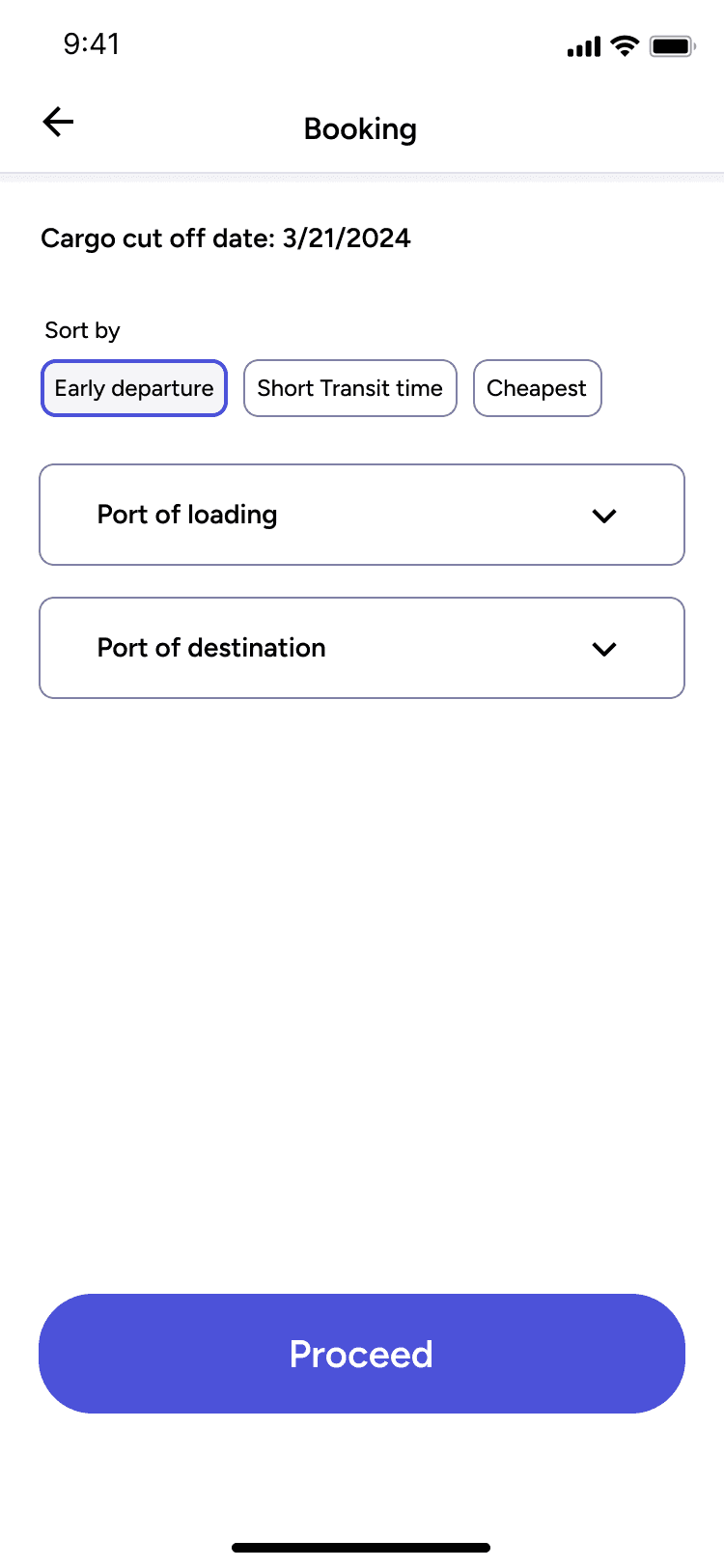 Users can sort the vessels by selecting options based on their priorities, such as earliest departure, shortest transit time, or lowest freight cost.