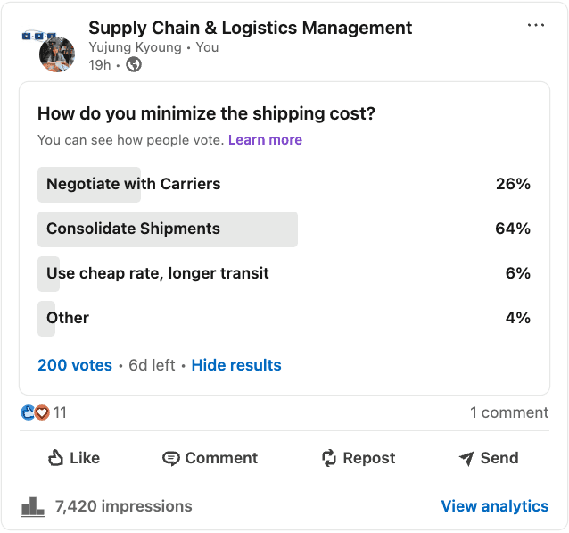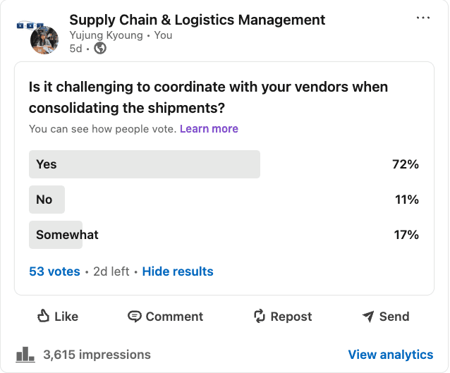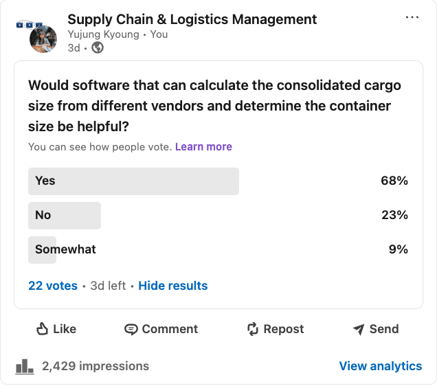My target audience consists of a specific group of individuals with experience in logistics, including those from freight forwarding, supply chain, and trading companies. I reached out to professionals on LinkedIn, specifically targeting individuals with relevant logistics experience. Additionally, I leveraged my network of former coworkers from my time working in the logistics industry.